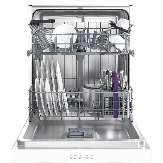 The Beko 60cm Freestanding Dishwasher in classic white is a reliable and efficient addition to any busy kitchen. With room for 14 place settings, it?s well suited to families or those who love to entertain. Designed to deliver powerful cleaning with every cycle, it uses just 15.3 litres of water per wash, helping reduce consumption without compromising performance. The Hygiene Intense function offers an extra level of cleanliness, ideal for baby bottles or cutting boards, while the Extra Dry feature ensures dishes come out cupboard-ready. For those short on time, the Quick & Shine program cleans in just 58 minutes. The upper basket can be adjusted across three height levels, giving you the flexibility to fit larger pots and awkward items below. A convenient time delay function lets you set washes around your schedule. Measuring 850mm high and 598mm wide, this freestanding dishwasher combines everyday practicality with thoughtful features to simplify your routine.