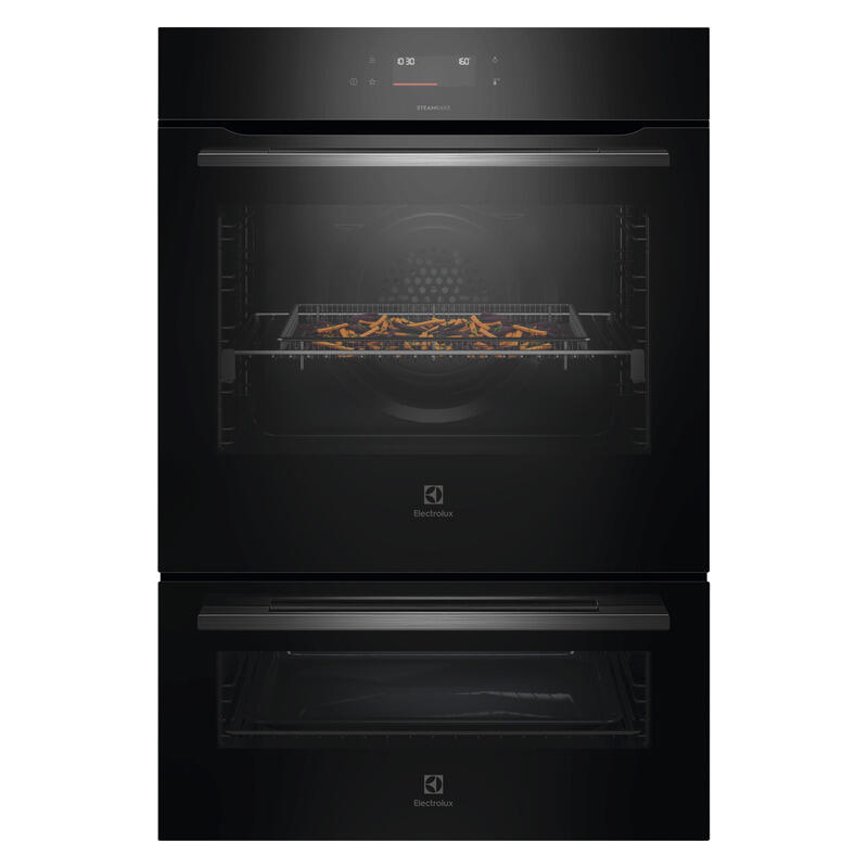 The Electrolux Series 600 Steam Bake 24 Function Pyrolytic Duo Oven offers a premium cooking experience with the flexibility of a dual oven in one streamlined appliance. SteamBake technology enhances results by introducing moisture, ideal for baking and roasting with improved texture and flavour. The AirFryPlus function makes it easy to enjoy crispy dishes with less oil, while the food probe ensures precise cooking by tracking internal temperatures. Featuring 46 assisted cooking programs, it supports a wide variety of recipes with consistent outcomes. Its pyrolytic self cleaning function reduces cleaning time by turning grease and residue into ash, making it a convenient and efficient addition to any modern kitchen.