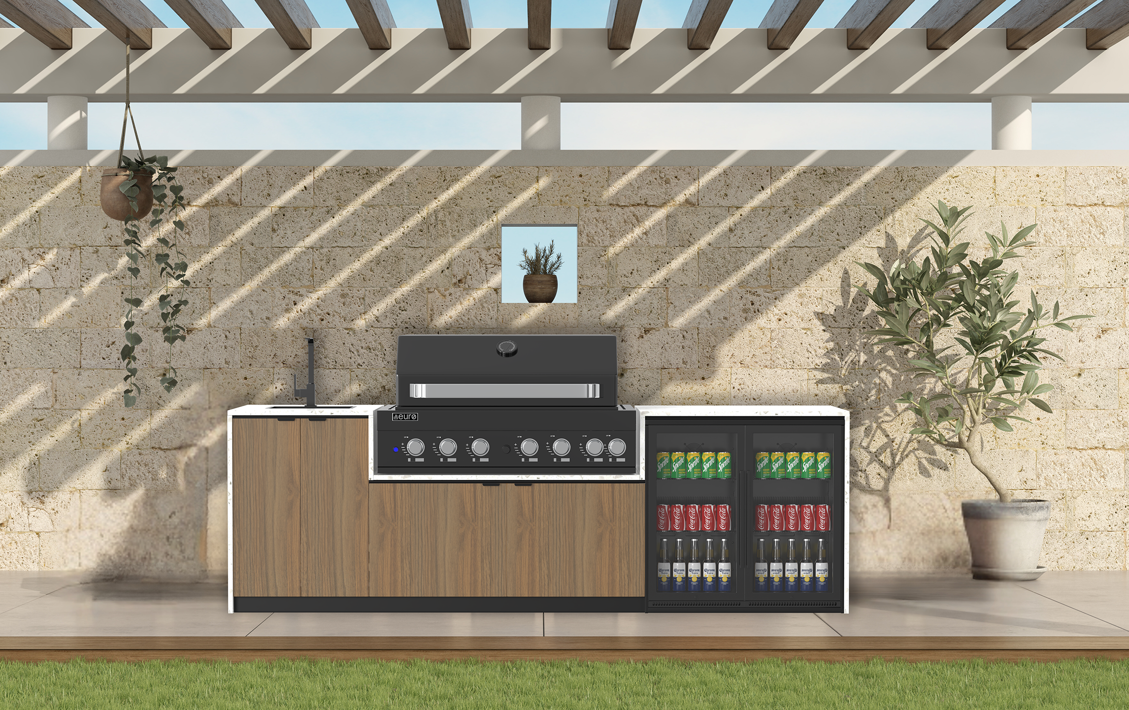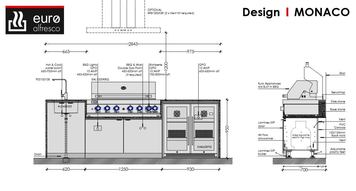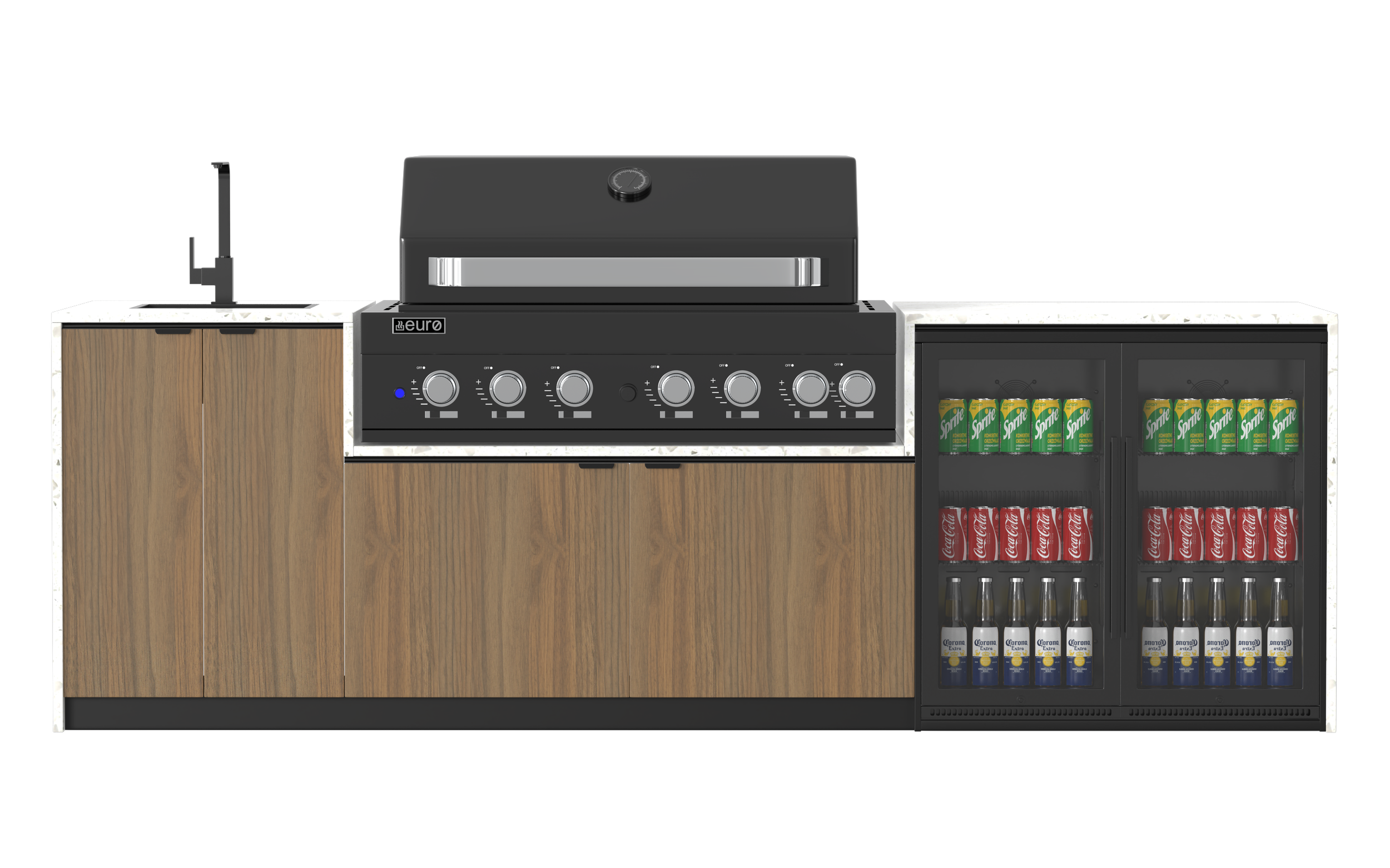 Euro Monaco Alfresco Kitchen - 2845mm wide - 1200mm BBQ + Cabinetry + 20mm Stone Benchtop + Mixer Tap + Undermount sink + Double Door Beverage Cooler