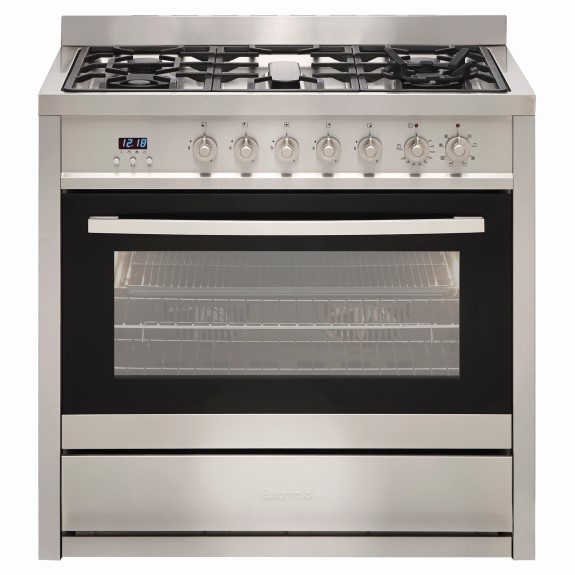 The Euromaid 90cm Freestanding Dual Fuel Cooker is a versatile and efficient kitchen appliance designed to meet the cooking needs of home chefs and cooking enthusiasts. With its sleek and modern design, it adds a stylish touch to any kitchen and combines the benefits of both gas and electric cooking. The gas cooktop features five burners, allowing you to simultaneously cook various dishes at different heat levels while the electric oven offers precise temperature control and even heat distribution for baking, roasting, and other oven-based cooking methods. The user-friendly controls and a clear display ensure easy operation and monitoring of cooking settings and includes various cooking modes and functions to cater to different recipes and cooking preferences. For added convenience, this cooker is equipped with a range of practical features. It includes a built-in timer, allowing you to set cooking times and alerts. The oven also features a removable glass door and inner glass panels, making cleaning hassle-free. With its gas cooktop, electric oven, spacious design, and user-friendly features, this 90cm Dual Fuel Cooker from Euromaid is an excellent choice for those seeking a reliable and efficient cooking appliance for their kitchen.