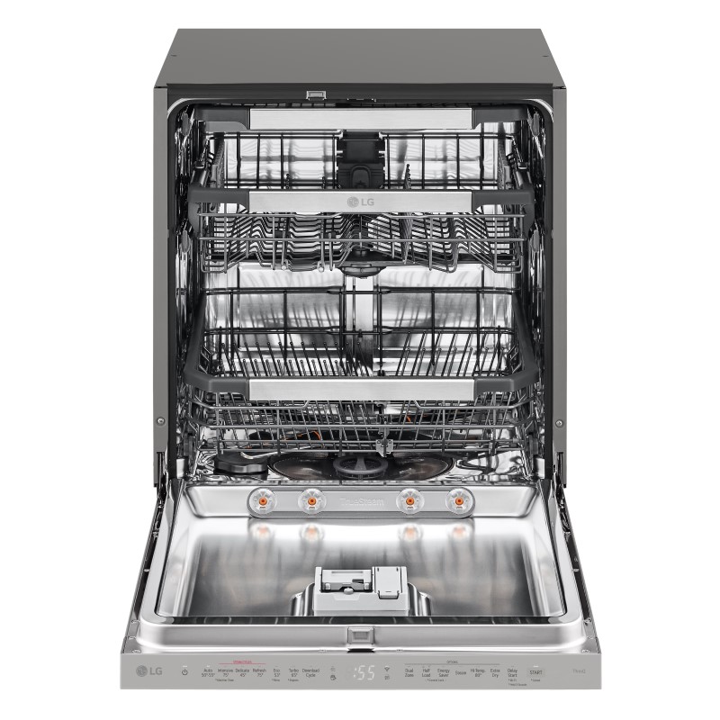The LG 60cm QuadWash Built-In Dishwasher in Platinum Steel combines cutting-edge technology with sleek, modern design for effortless cleaning. Featuring LG?s powerful QuadWash system, it uses multi-directional spray arms to ensure every dish is thoroughly cleaned from every angle. TrueSteam technology delivers sparkling results by reducing water spots and improving drying performance. With a spacious 15-place setting capacity, it?s perfect for large households or those who love to entertain. The Auto Open Dry function enhances drying efficiency by automatically opening the door at the end of the cycle to release excess moisture. Powered by an Inverter Direct Drive motor, this dishwasher operates quietly and efficiently, reducing energy consumption while delivering outstanding performance. Plus, with ThinQ connectivity, you can monitor and control your dishwasher remotely for added convenience. Designed to seamlessly integrate into your kitchen, this built-in dishwasher brings premium cleaning power to your home.