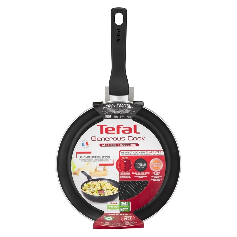 The Tefal 24cm Generous Induction Non-Stick Frypan combines durability and versatility, making it ideal for all your cooking needs. Its wide compatibility with induction, gas, electric, ceramic, and halogen hobs ensures smooth integration into any kitchen. The durable titanium non-stick coating allows for effortless food release and easy cleanup, perfect for everyday cooking. Equipped with Tefal?s innovative Thermo-Signal technology, the frypan signals when it reaches the optimal cooking temperature, ensuring flawless results every time. Its advanced induction technology provides rapid and even heat distribution for consistent, professional-level performance. Made in France, the Tefal 24cm Generous Cook Frypan offers top-notch quality and performance for home cooks.