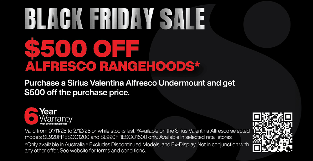 Get $500 off the purchase price when you buy a select Sirius Valentina Alfresco Undermount rangehood. Offer valid on eligible models at participating Australian retailers from 1 Nov to 2 Dec 2025, while stocks last.