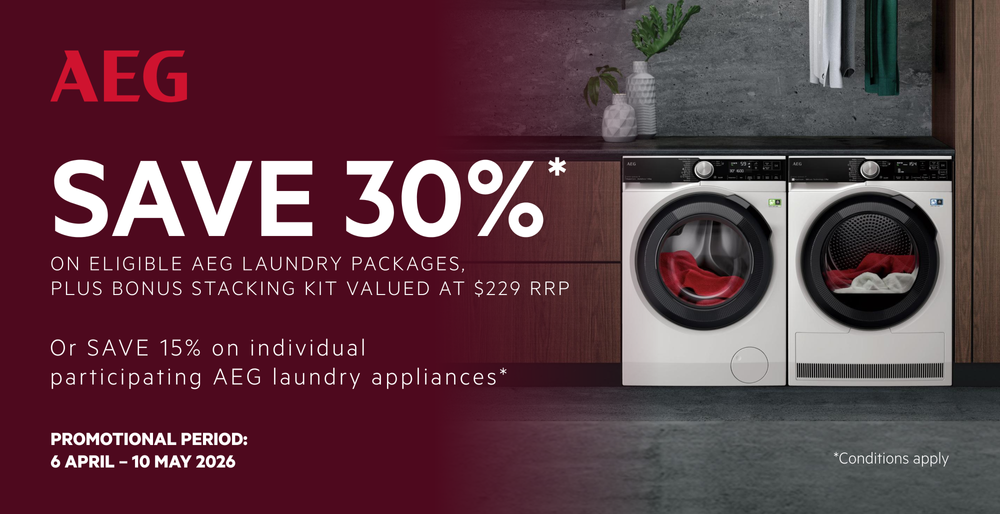 Save a total of 30% on select AEG washers and dryers when purchased together in one transaction. Valid for eligible models purchased between 6 April – 10 May. T&C’s apply.